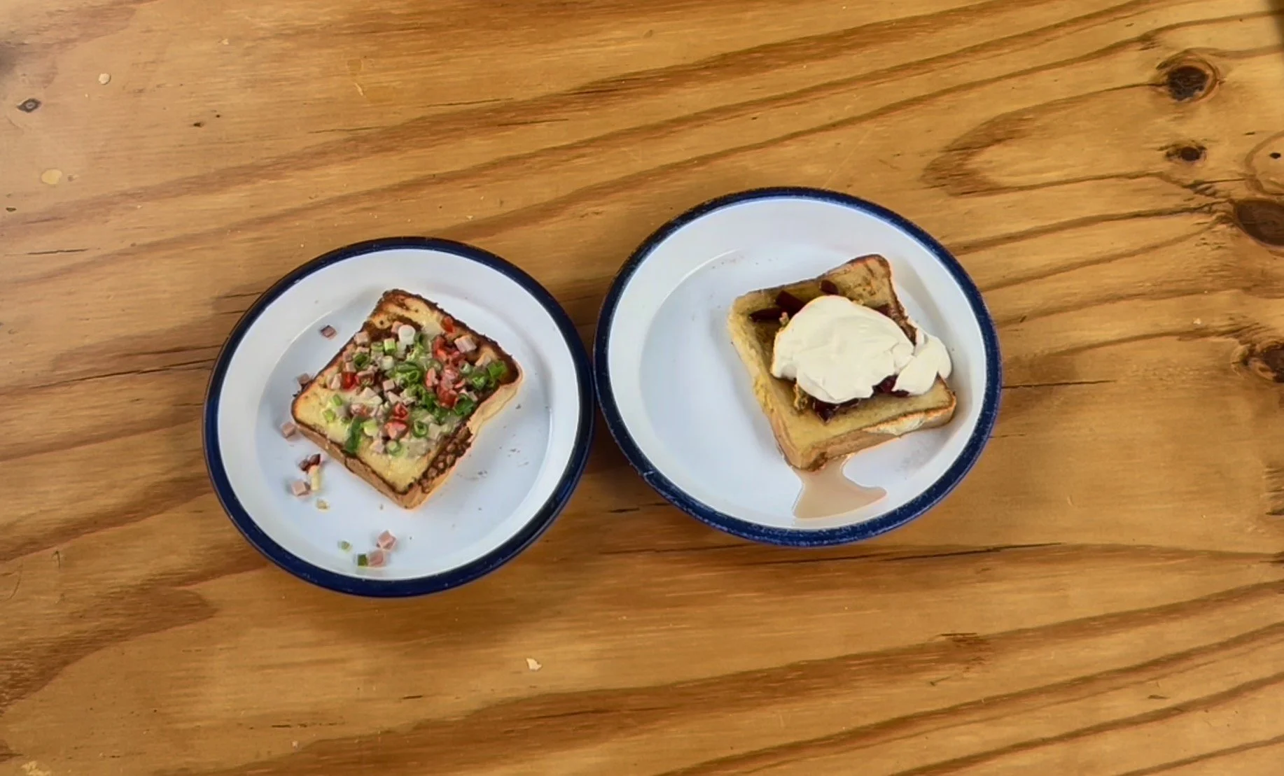Savoury one, sprinkle with ham, spring onions, tomatoes and colby cheese.