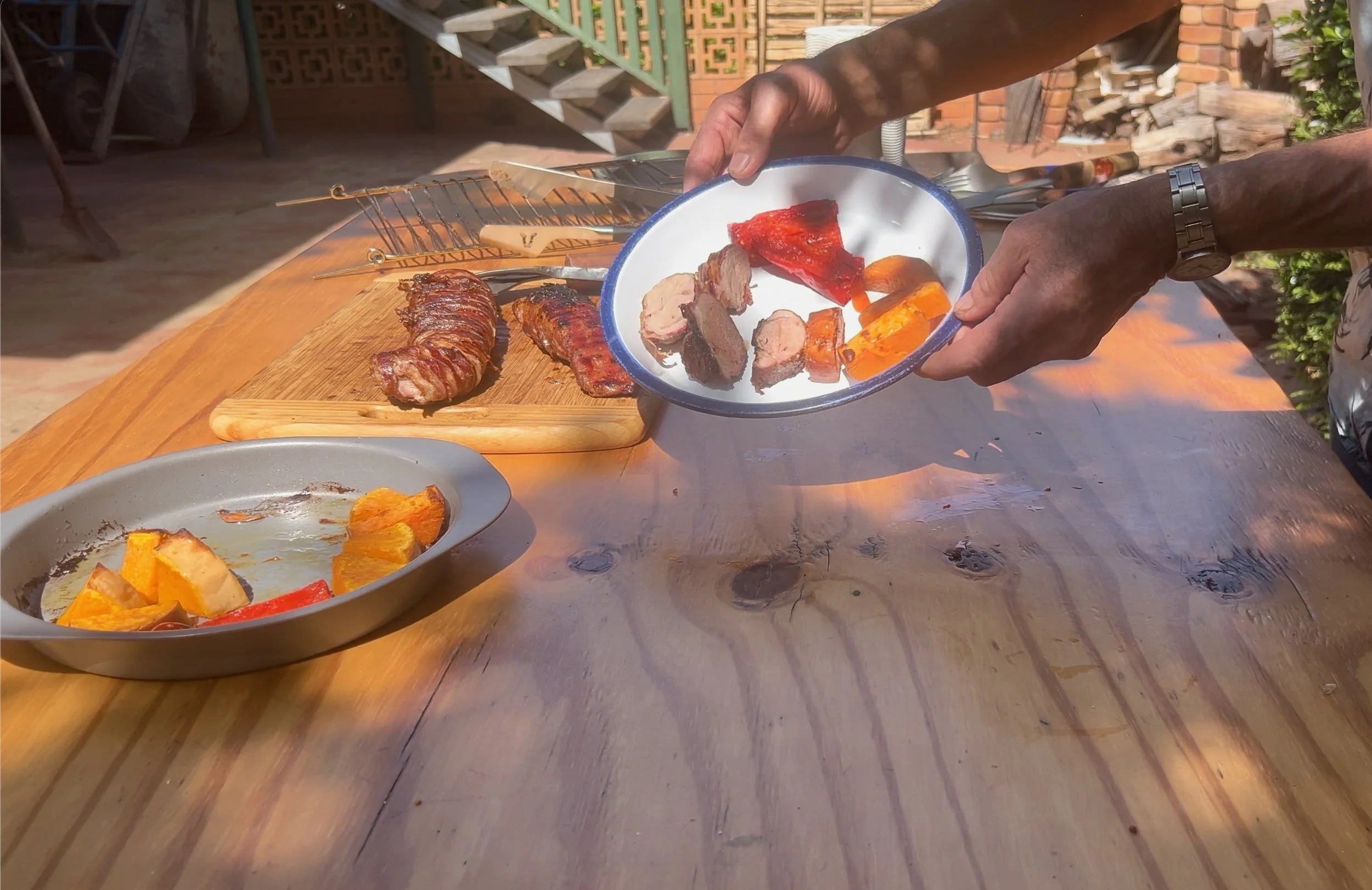 Slice veges, toss in oil, place in roasting try add a couple of knobs off butter and salt and pepper. Roast in med oven for about 30 mins.The chicken rub linked with the smokey flavour from the coals, lifts the chicken to another level, coupled with steamed sweet potato and carrots finished with butter and salt and pepper.